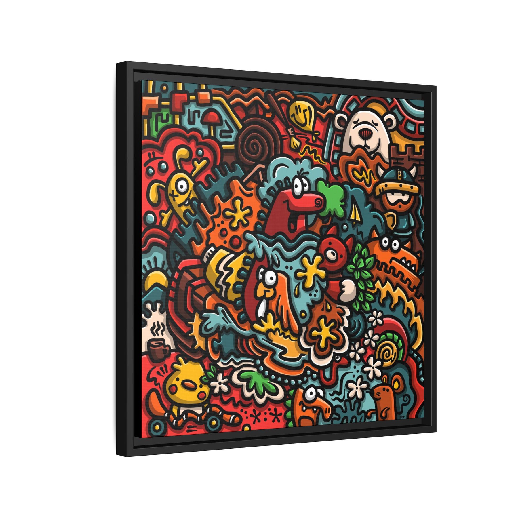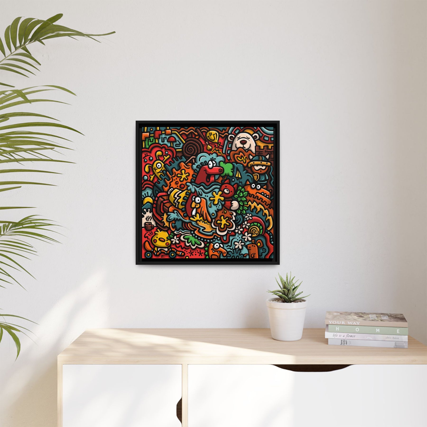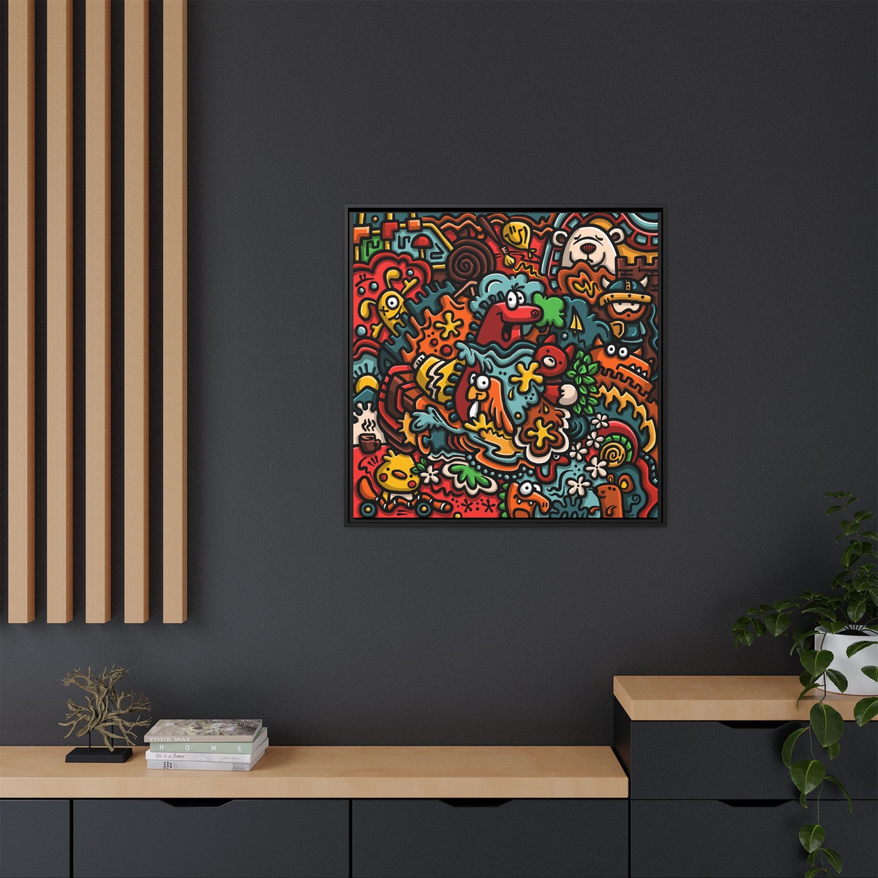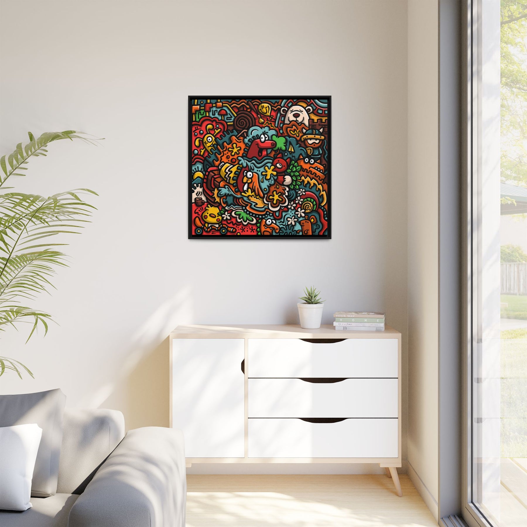 A vibrant matte canvas print framed in a slim pine profile that brings upbeat, playful energy to any room. The artwork bubbles with hand-drawn characters, bold outlines, and a warm, saturated palette — imagine a crowded street of smiling creatures, floral bursts, and quirky details that keep your eye exploring. The matte finish reduces glare while preserving intense colors and contrast. Hung in a living room, studio, or hallway, this framed canvas becomes a conversation starter that feels both cheerful and artful. The sustainably sourced pine frame and museum-style coating give it a refined edge without losing the design’s joyful, street-art spirit.