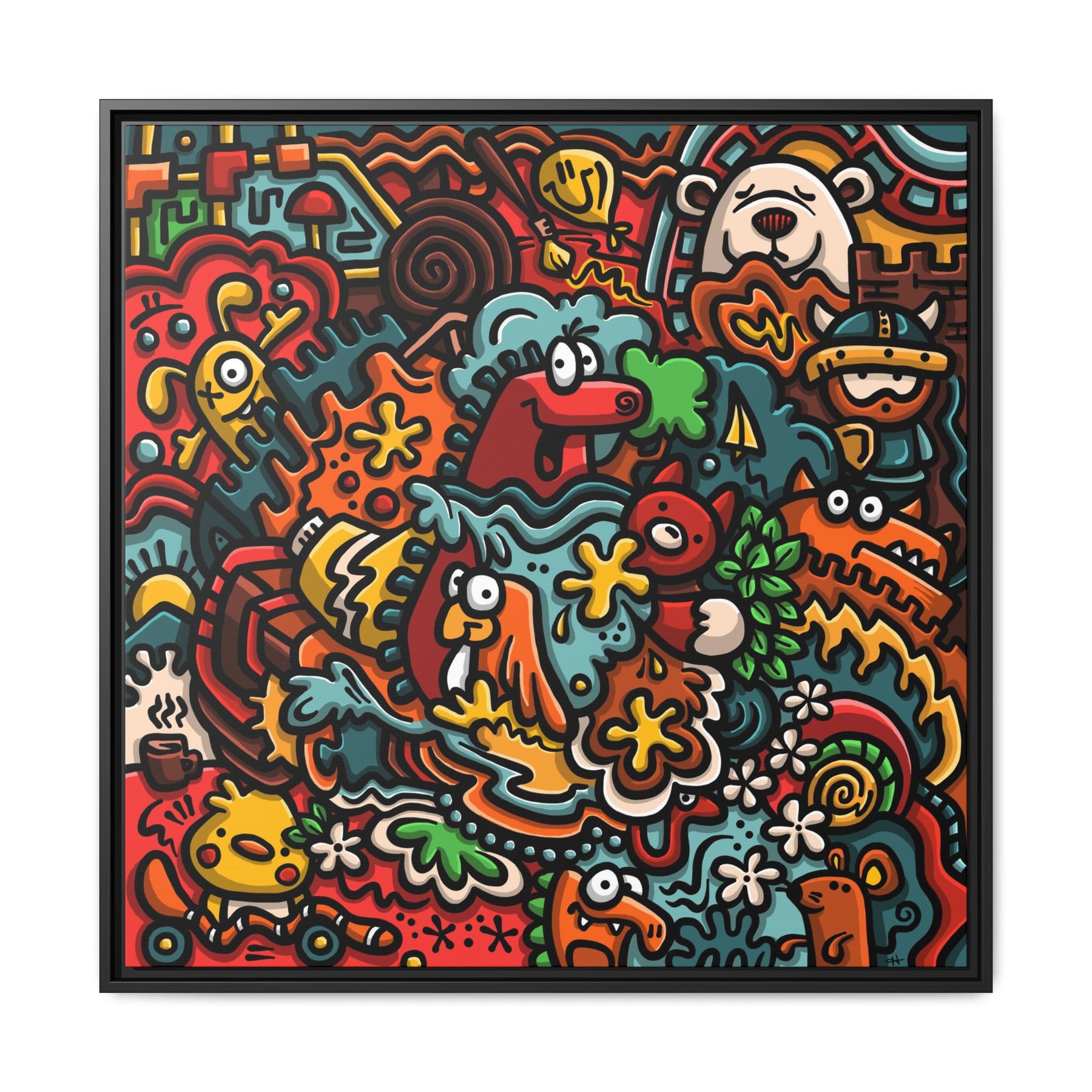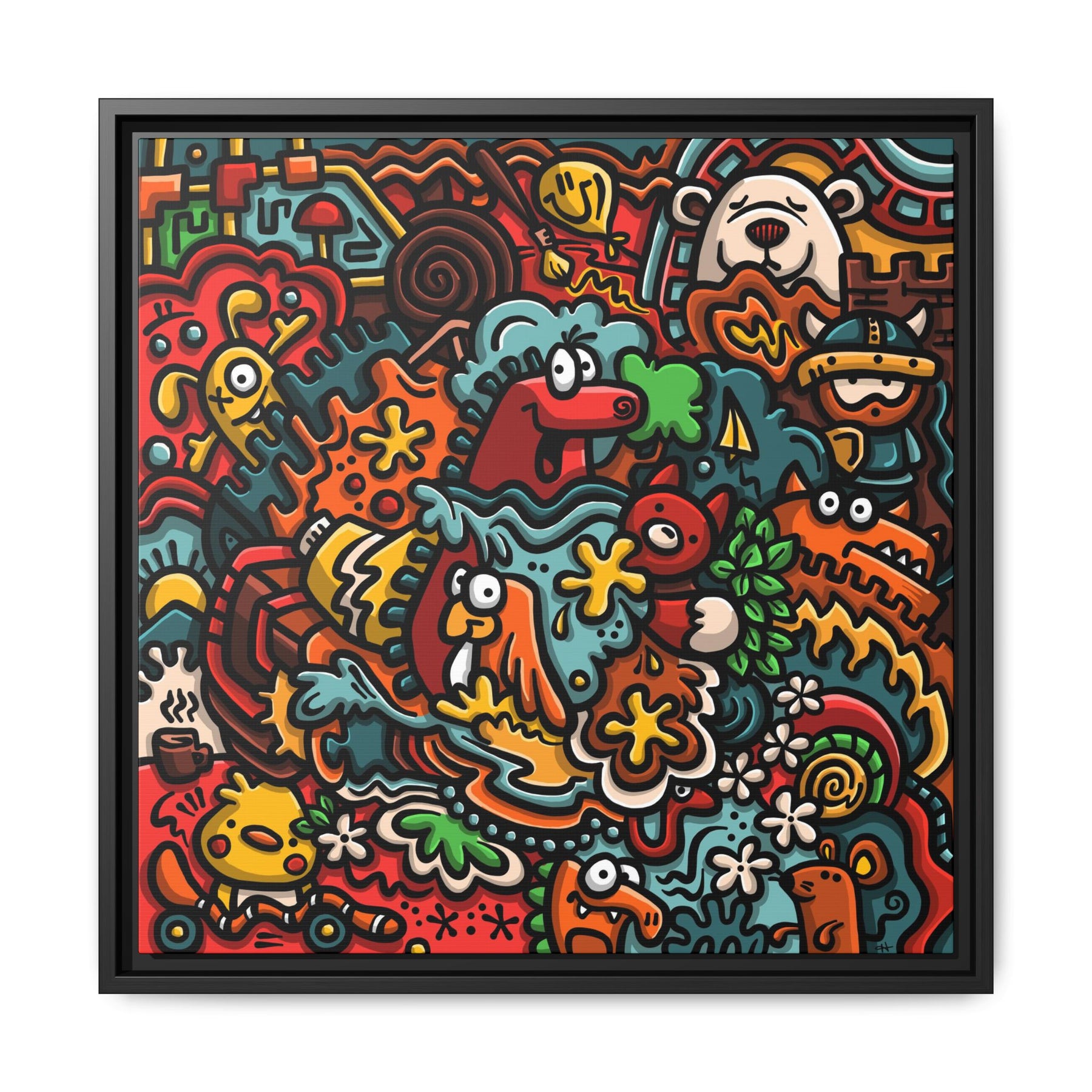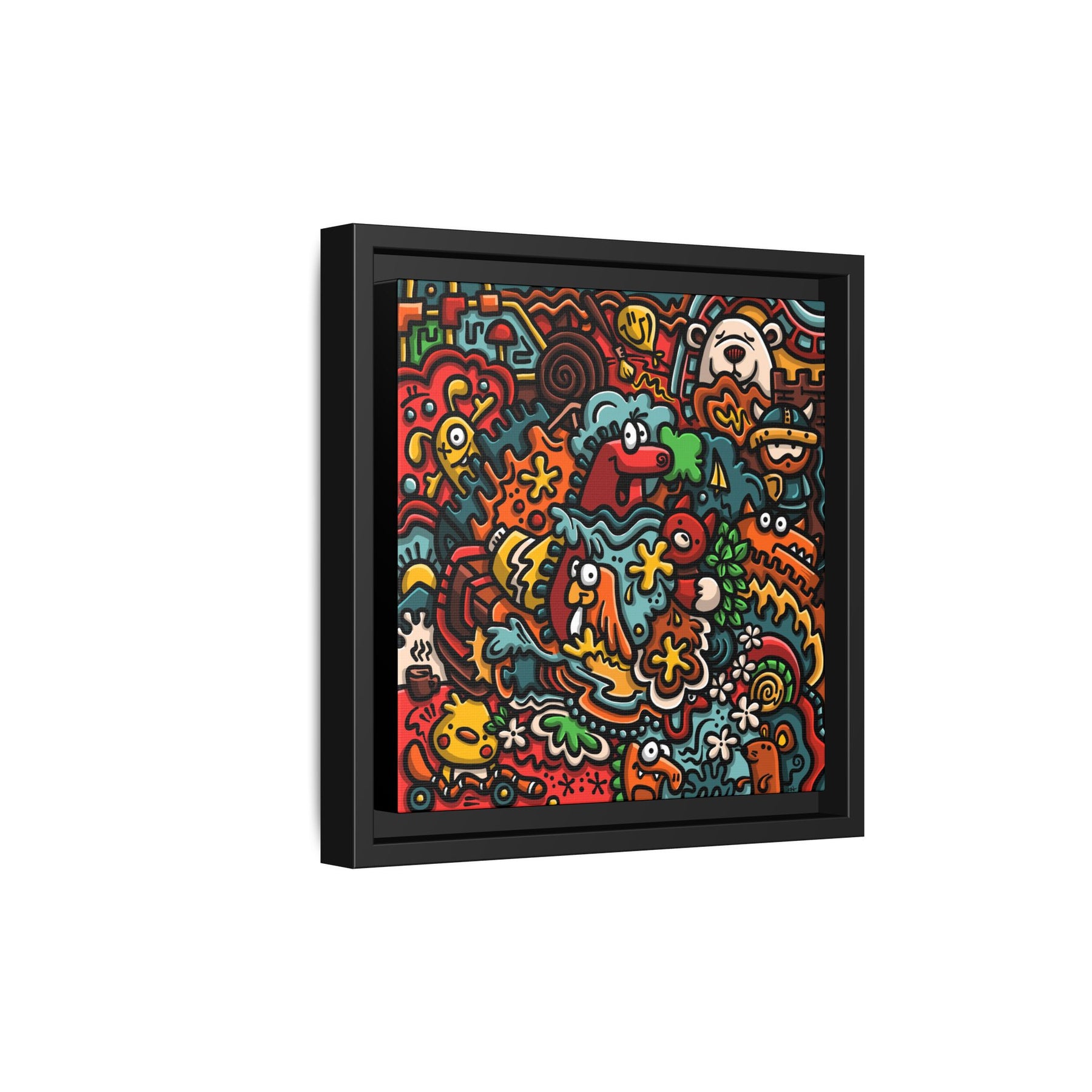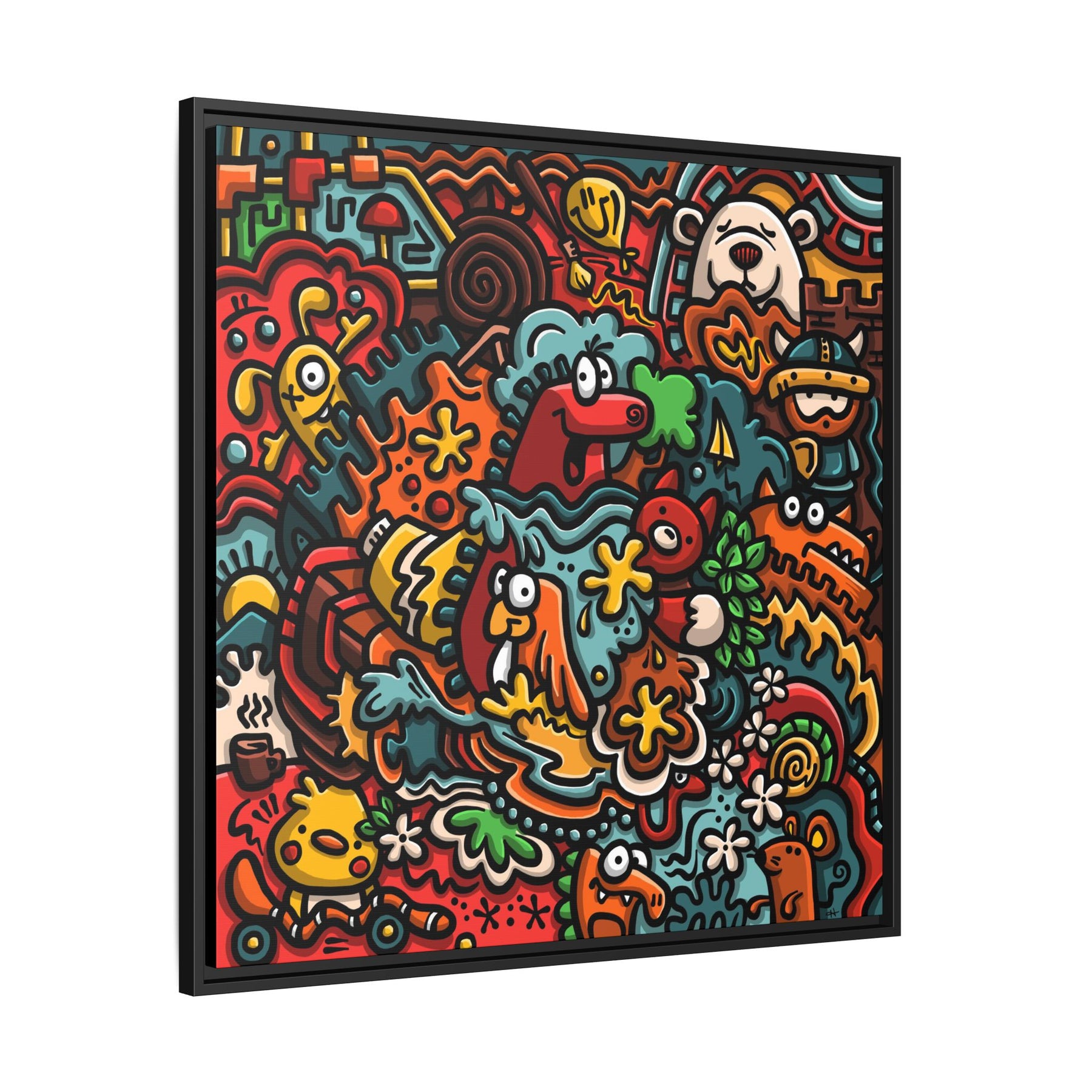 A vibrant matte canvas print framed in a slim pine profile that brings upbeat, playful energy to any room. The artwork bubbles with hand-drawn characters, bold outlines, and a warm, saturated palette — imagine a crowded street of smiling creatures, floral bursts, and quirky details that keep your eye exploring. The matte finish reduces glare while preserving intense colors and contrast. Hung in a living room, studio, or hallway, this framed canvas becomes a conversation starter that feels both cheerful and artful. The sustainably sourced pine frame and museum-style coating give it a refined edge without losing the design’s joyful, street-art spirit.