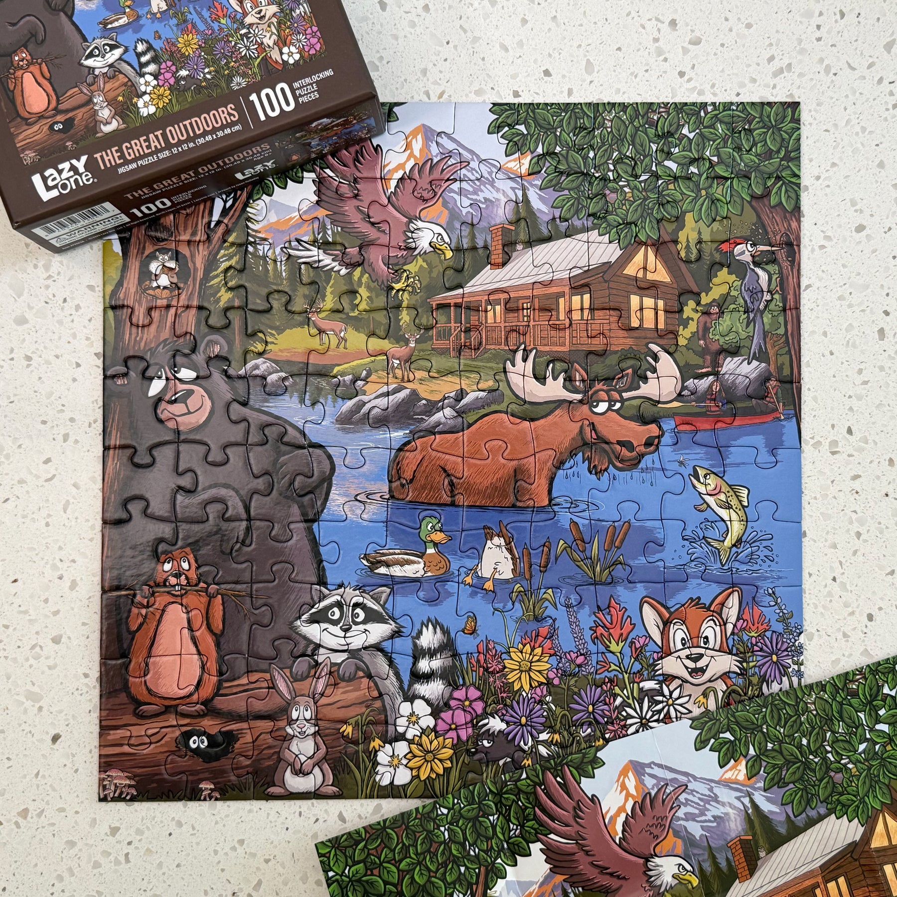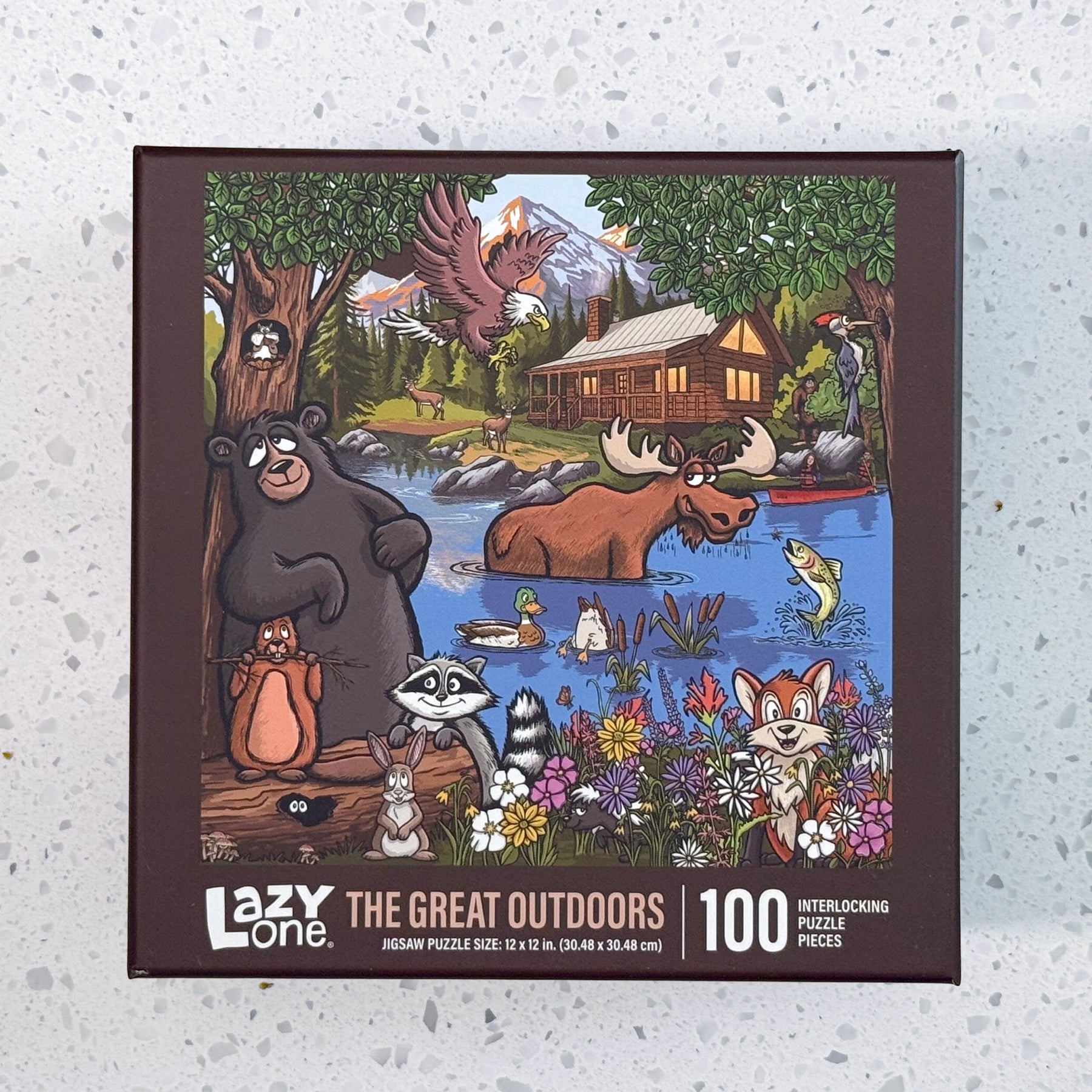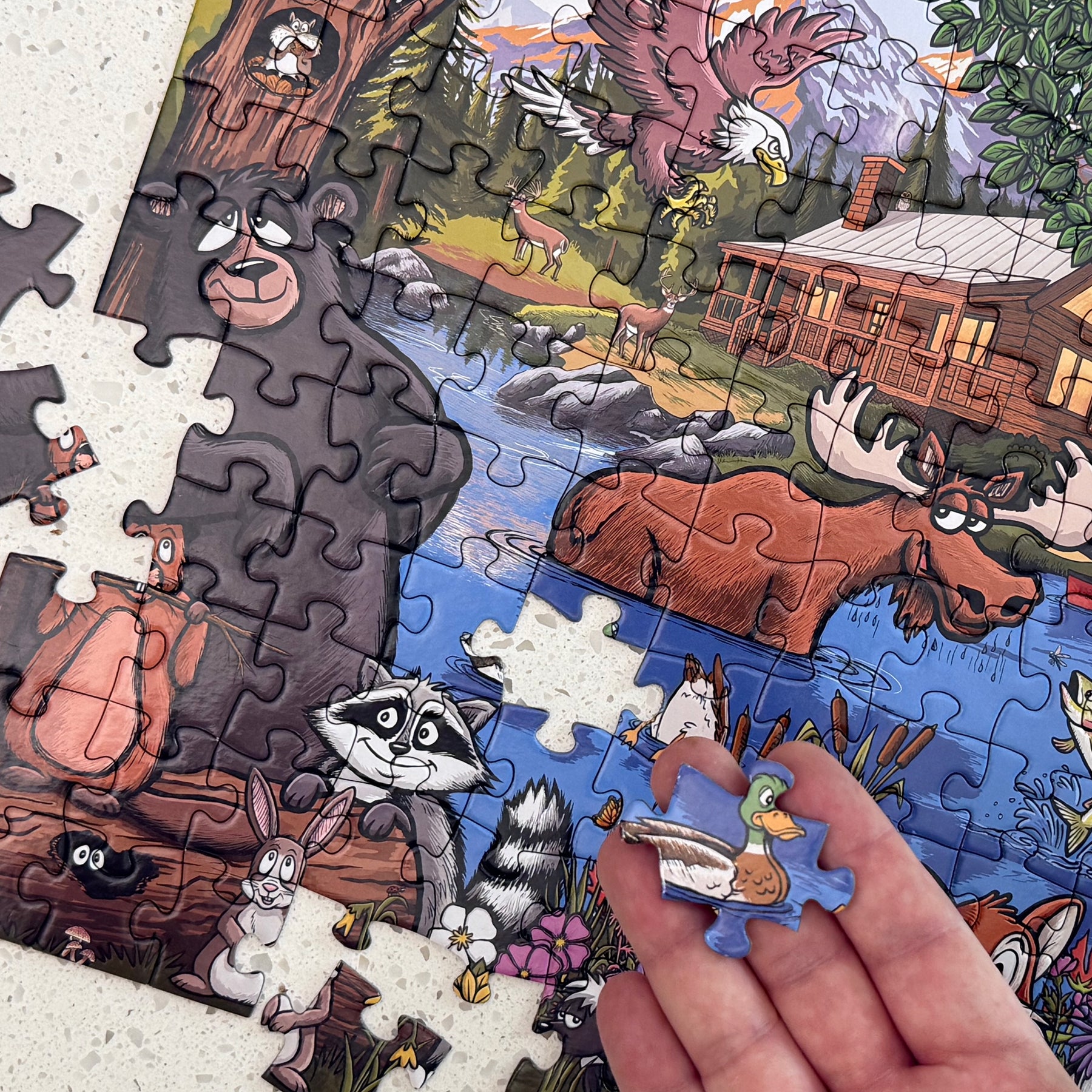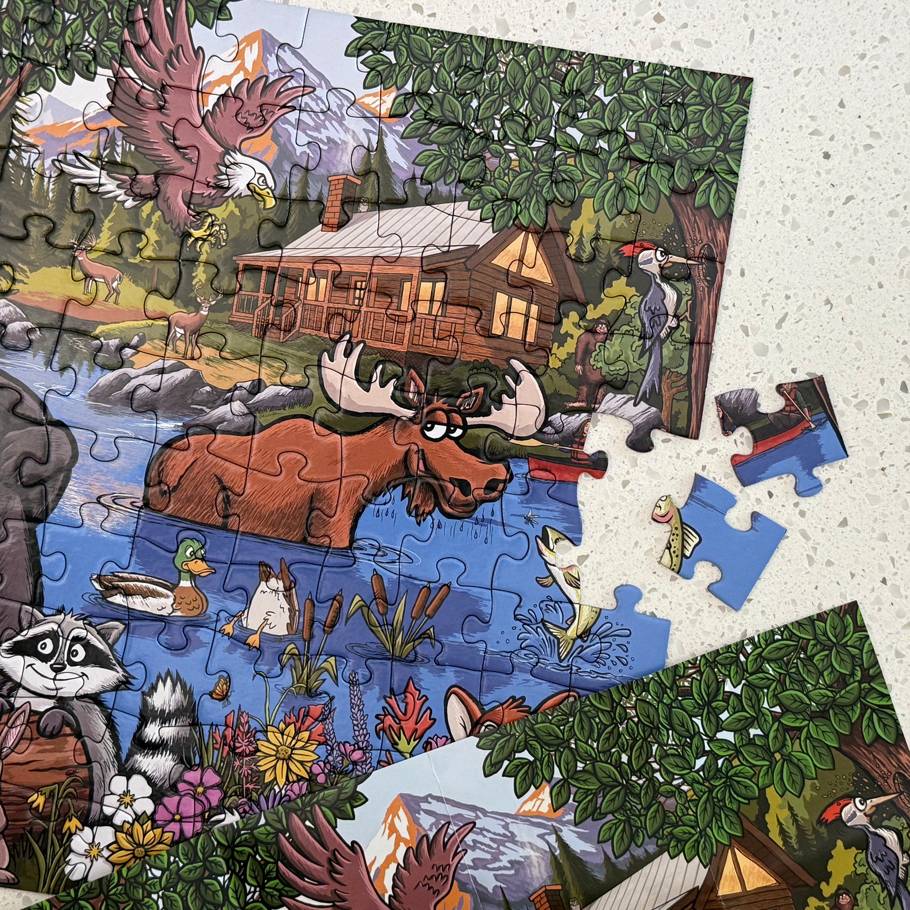 Step into The Great Outdoors, where every puzzle piece brings a little wilderness magic to life. This charming illustrated scene is packed with delightful discoveries—from a curious moose and playful ducks to a busy beaver, a sneaky raccoon, a friendly skunk, a black bear, an eagle, a woodpecker, a rabbit, and a trout. And yes… if you look closely, you might even spot Bigfoot hiding among the trees.
